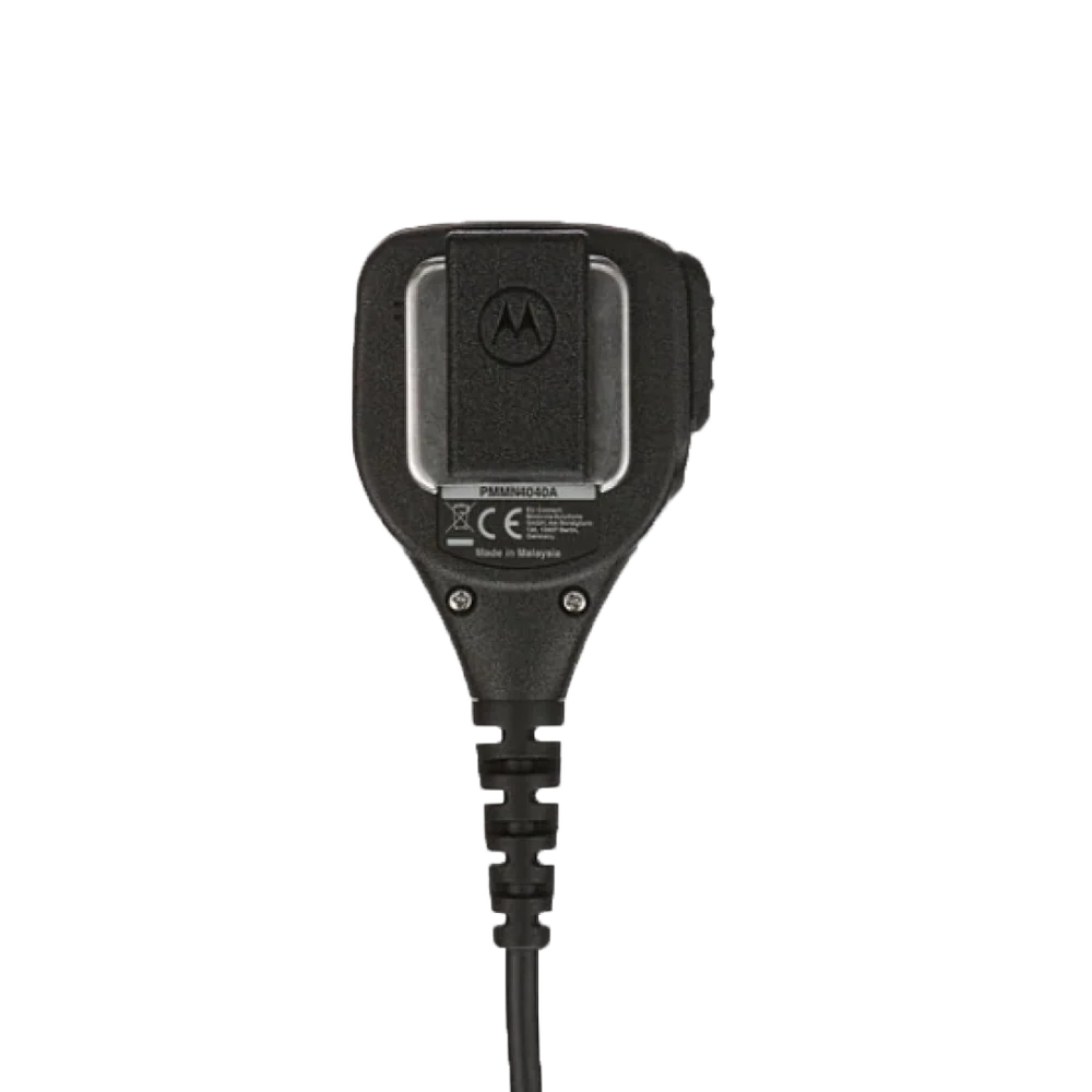 The Motorola PMMN4040 RSM is built for tough environments, combines wind-porting technology to reduce wind and moisture interference, with a sealed housing rated IP57 for dust and brief submersion. It includes a glove-friendly push-to-talk switch, a threaded 3.5 mm jack for earpiece connectivity, and FM intrinsic safety certification. Compact and dependable, this mic ensures hands-free operation in the field, making it suitable for public safety, utilities, and industrial applications using MOTOTRBO XPR-series radios.